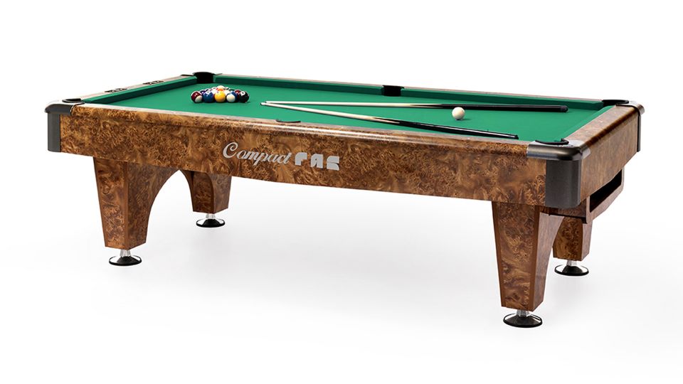 3) Compact 8, un elegante tavolo da biliardo con il campo di gioco in ardesia, sponde professionali e piedini regolabili.