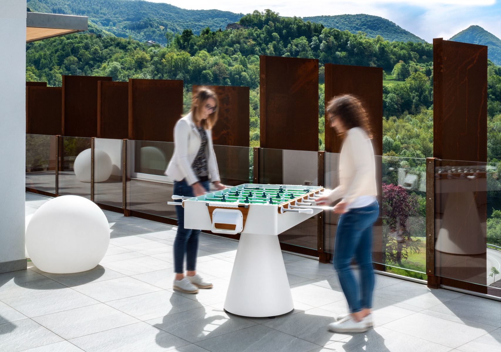 Il campo da gioco: in un calciobalilla standard, professionale o non, da interno troviamo un cartoncino, generalmente verde, sopra il quale viene applicato un vetro per permettere alla pallina di avere un migliore scorrimento. In quelli da esterno invece, viene applicato direttamente un vetro serigrafato verde; questo perché acqua e umidità potrebbero andare ad intaccare il cartoncino sottovetro, creando delle pieghe spiacevoli alla vista, che alla lunga possono anche compromettere la giocabilità. Il vetro serigrafato invece, resiste perfettamente all’acqua;