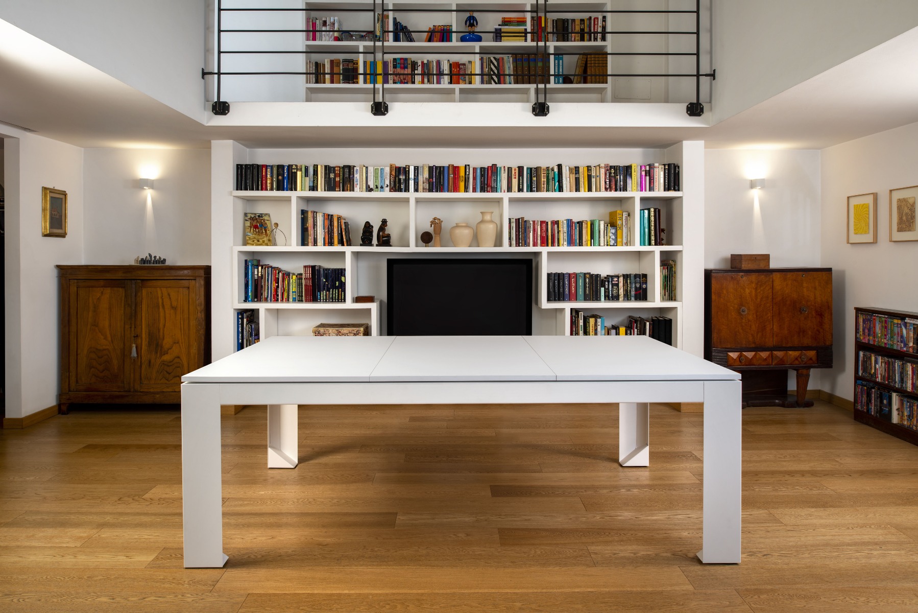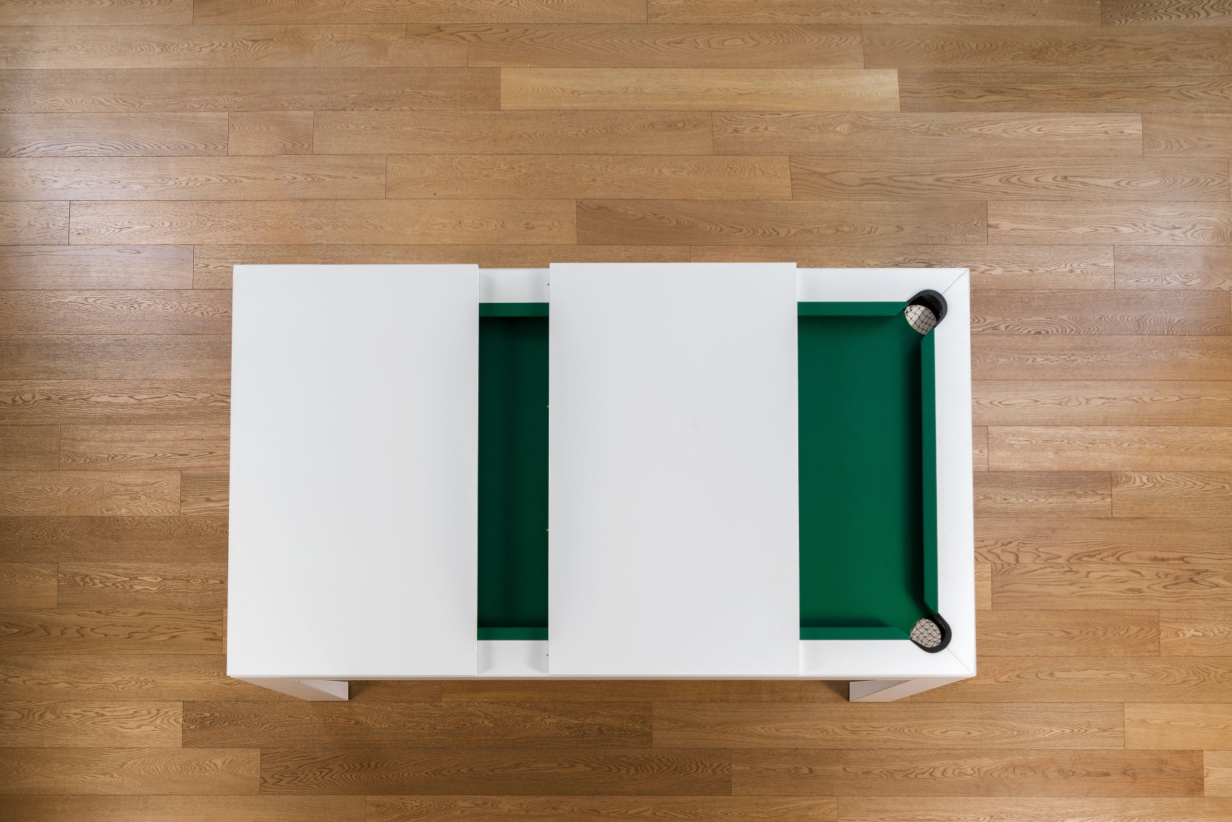 Un elegante tavolo contemporaneo cela al suo interno un segreto: un tavolo da biliardo. È sufficiente riporre il piano, scomposto in tre parti, in uno stipo a scomparsa ed il gioco è fatto!