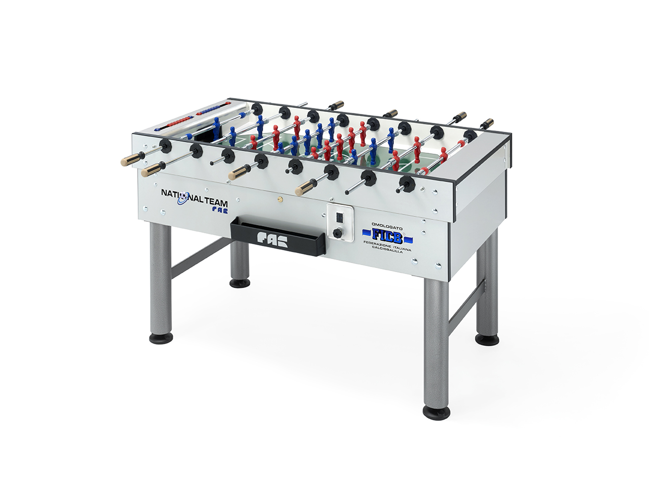 Parlando di calciobalilla professionali, il principe dei calciobalilla FAS è il National Team FICB, il nostro calciobalilla omologato dalla federazione. È costruito da un mobile in multistrato di pioppo spesso 30 mm, ricoperto di laminato plastico. È dotato di gambe pesanti e piedini regolabili per giocare su tutte le superfici. Inoltre, è provvisto di bolla di livella per essere sempre sicuri di giocare in piano e di manopole FAS, il nostro brevetto che garantisce una migliore presa.