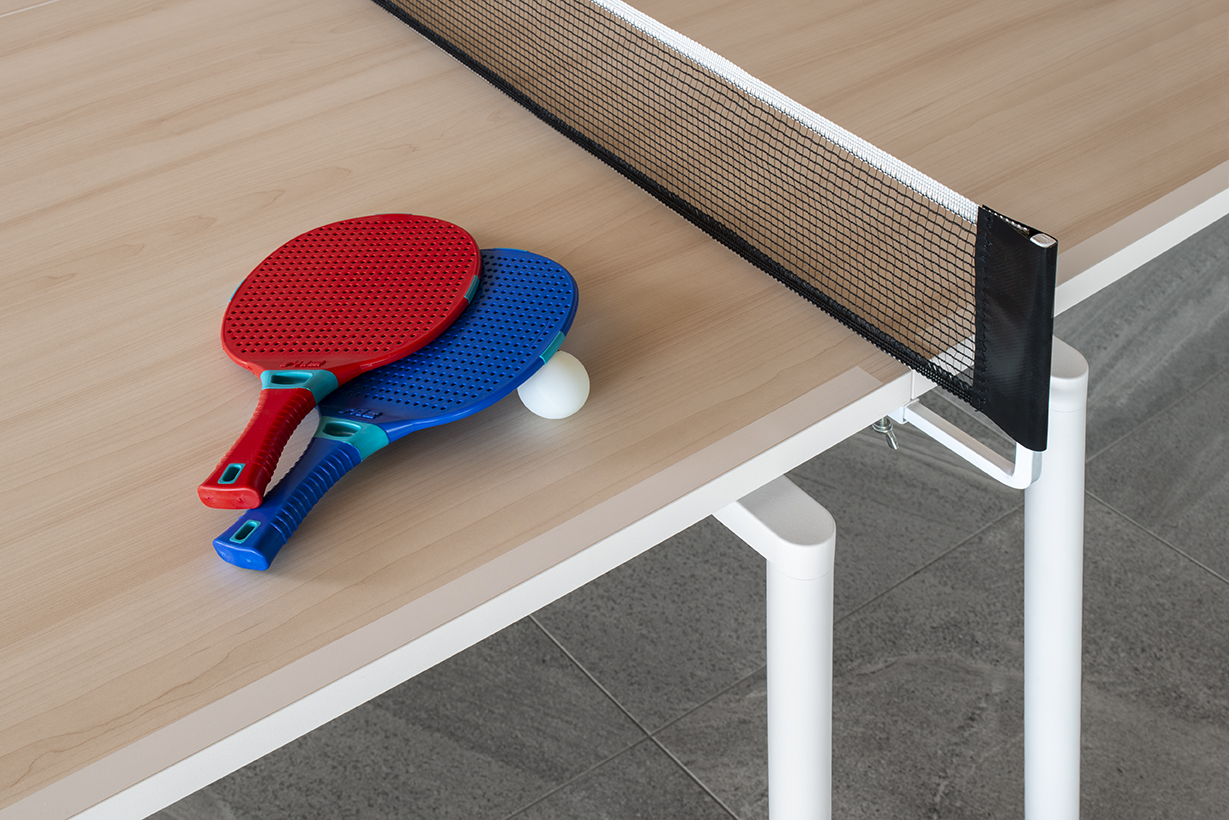 SPIDER è un tavolo da ping pong innovativo, capace di trasformarsi all’occorrenza in un tavolo conviviale e di scomporsi con pochi gesti per essere riposto quando non serve grazie agli agganci tecnici sapientemente nascosti al di sotto del piano di gioco.